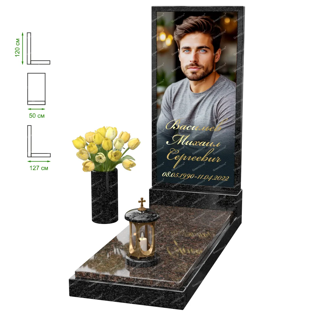 Визуально комплекс отличается от типовой формы не только формой, но и размерами. Массивная стела позволяет дизайнеру реализовать практически любые задумки и пожелания Заказчика, придать готовому изделию солидный вид, раскрыть все достоинства использованного в его изготовлении гранита. Такой габаритный памятник требует профессиональной доставки и установки. Все это также можно заказать в мастерской Грин-Стоун.