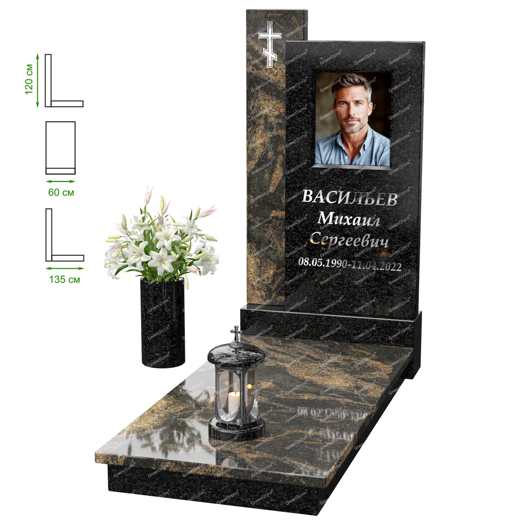 Визуально комплекс отличается от типовой формы не только формой, но и размерами. Массивная стела позволяет дизайнеру реализовать практически любые задумки и пожелания Заказчика, придать готовому изделию солидный вид, раскрыть все достоинства использованного в его изготовлении гранита. Такой габаритный памятник требует профессиональной доставки и установки. Все это также можно заказать в мастерской Грин-Стоун.