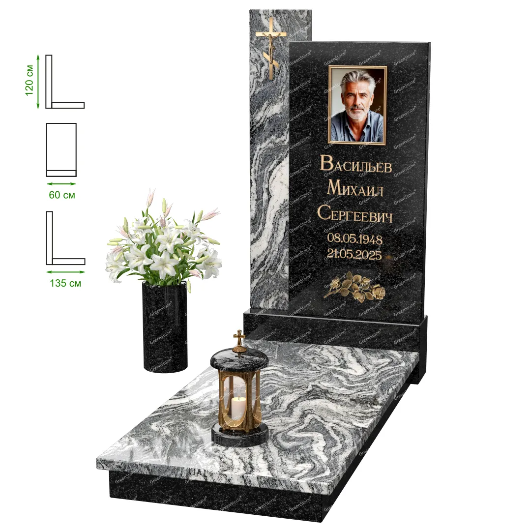 Визуально комплекс отличается от типовой формы не только формой, но и размерами. Массивная стела позволяет дизайнеру реализовать практически любые задумки и пожелания Заказчика, придать готовому изделию солидный вид, раскрыть все достоинства использованного в его изготовлении гранита. Такой габаритный памятник требует профессиональной доставки и установки. Все это также можно заказать в мастерской Грин-Стоун.