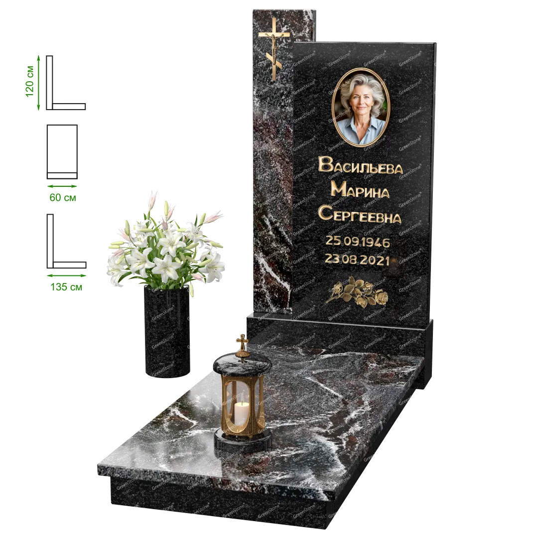 Визуально комплекс отличается от типовой формы не только формой, но и размерами. Массивная стела позволяет дизайнеру реализовать практически любые задумки и пожелания Заказчика, придать готовому изделию солидный вид, раскрыть все достоинства использованного в его изготовлении гранита. Такой габаритный памятник требует профессиональной доставки и установки. Все это также можно заказать в мастерской Грин-Стоун.
