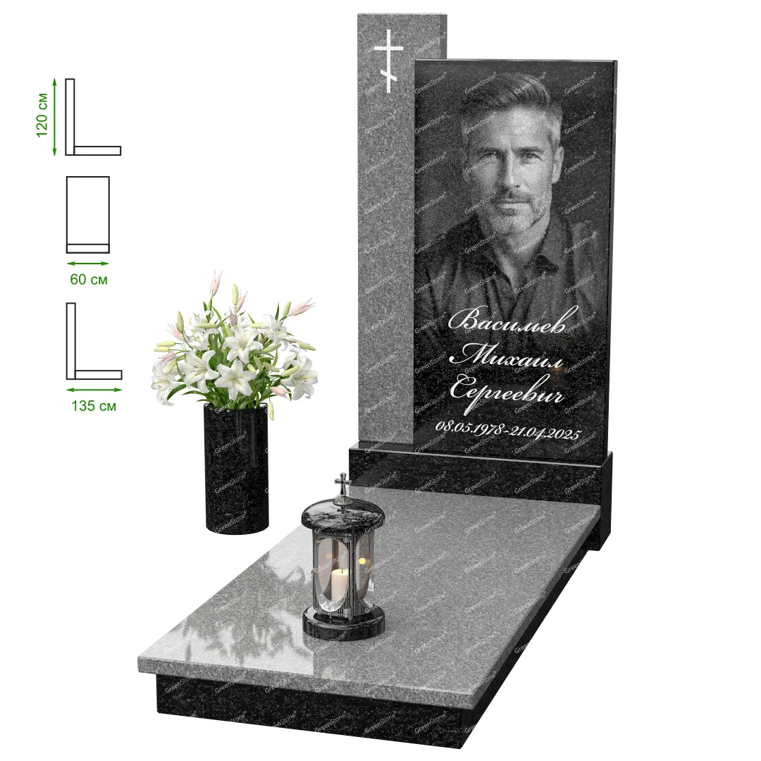 Визуально комплекс отличается от типовой формы не только формой, но и размерами. Массивная стела позволяет дизайнеру реализовать практически любые задумки и пожелания Заказчика, придать готовому изделию солидный вид, раскрыть все достоинства использованного в его изготовлении гранита. Такой габаритный памятник требует профессиональной доставки и установки. Все это также можно заказать в мастерской Грин-Стоун.