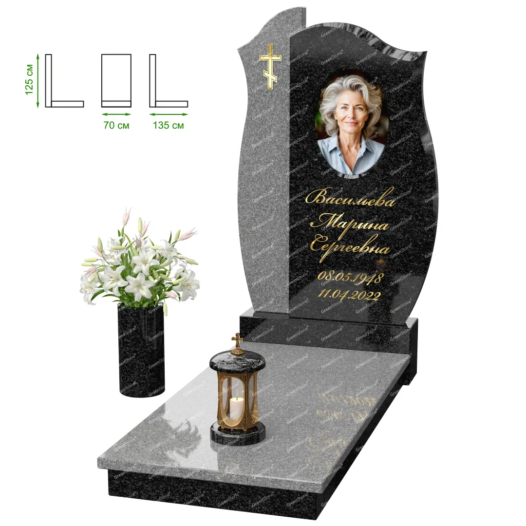 Визуально комплекс отличается от типовой формы не только формой, но и размерами. Массивная стела позволяет дизайнеру реализовать практически любые задумки и пожелания Заказчика, придать готовому изделию солидный вид, раскрыть все достоинства использованного в его изготовлении гранита. Такой габаритный памятник требует профессиональной доставки и установки. Все это также можно заказать в мастерской Грин-Стоун.