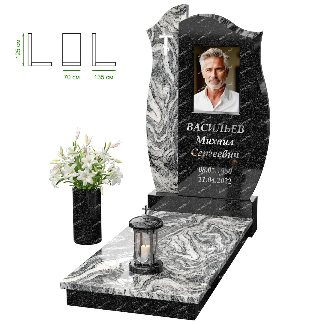 Визуально комплекс отличается от типовой формы не только формой, но и размерами. Массивная стела позволяет дизайнеру реализовать практически любые задумки и пожелания Заказчика, придать готовому изделию солидный вид, раскрыть все достоинства использованного в его изготовлении гранита. Такой габаритный памятник требует профессиональной доставки и установки. Все это также можно заказать в мастерской Грин-Стоун.