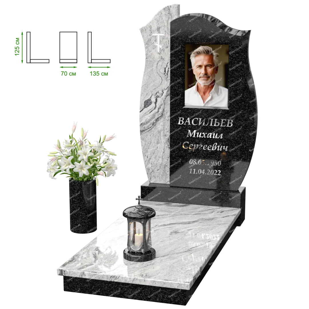 Визуально комплекс отличается от типовой формы не только формой, но и размерами. Массивная стела позволяет дизайнеру реализовать практически любые задумки и пожелания Заказчика, придать готовому изделию солидный вид, раскрыть все достоинства использованного в его изготовлении гранита. Такой габаритный памятник требует профессиональной доставки и установки. Все это также можно заказать в мастерской Грин-Стоун.