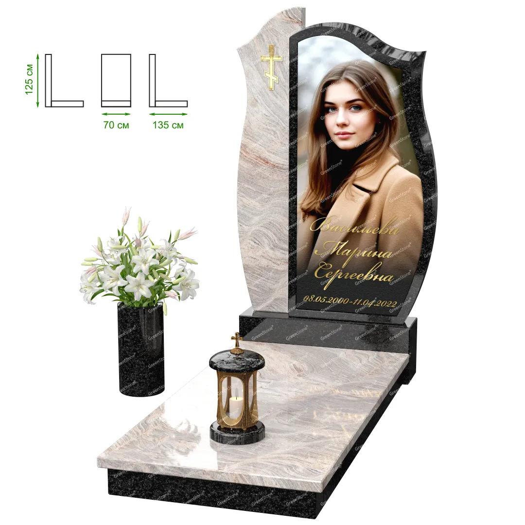 Визуально комплекс отличается от типовой формы не только формой, но и размерами. Массивная стела позволяет дизайнеру реализовать практически любые задумки и пожелания Заказчика, придать готовому изделию солидный вид, раскрыть все достоинства использованного в его изготовлении гранита. Такой габаритный памятник требует профессиональной доставки и установки. Все это также можно заказать в мастерской Грин-Стоун.