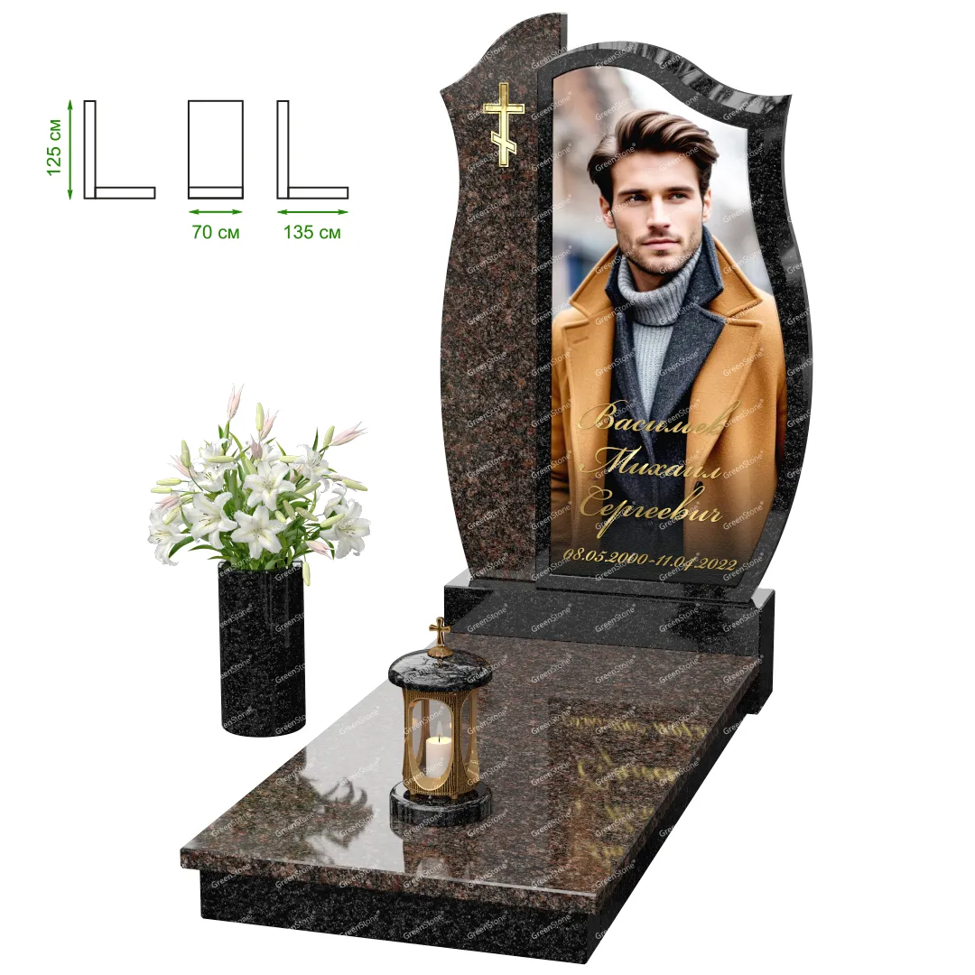 Визуально комплекс отличается от типовой формы не только формой, но и размерами. Массивная стела позволяет дизайнеру реализовать практически любые задумки и пожелания Заказчика, придать готовому изделию солидный вид, раскрыть все достоинства использованного в его изготовлении гранита. Такой габаритный памятник требует профессиональной доставки и установки. Все это также можно заказать в мастерской Грин-Стоун.