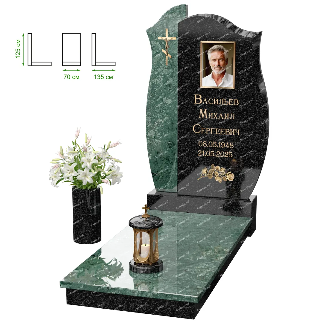 Визуально комплекс отличается от типовой формы не только формой, но и размерами. Массивная стела позволяет дизайнеру реализовать практически любые задумки и пожелания Заказчика, придать готовому изделию солидный вид, раскрыть все достоинства использованного в его изготовлении гранита. Такой габаритный памятник требует профессиональной доставки и установки. Все это также можно заказать в мастерской Грин-Стоун.