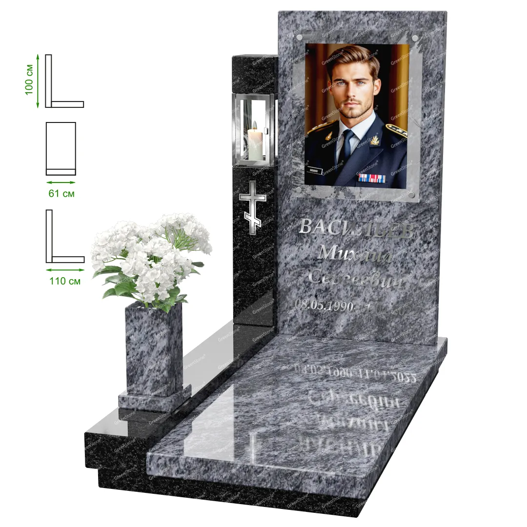 Визуально комплекс отличается от типовой формы не только формой, но и размерами. Массивная стела позволяет дизайнеру реализовать практически любые задумки и пожелания Заказчика, придать готовому изделию солидный вид, раскрыть все достоинства использованного в его изготовлении гранита. Такой габаритный памятник требует профессиональной доставки и установки. Все это также можно заказать в мастерской Грин-Стоун.