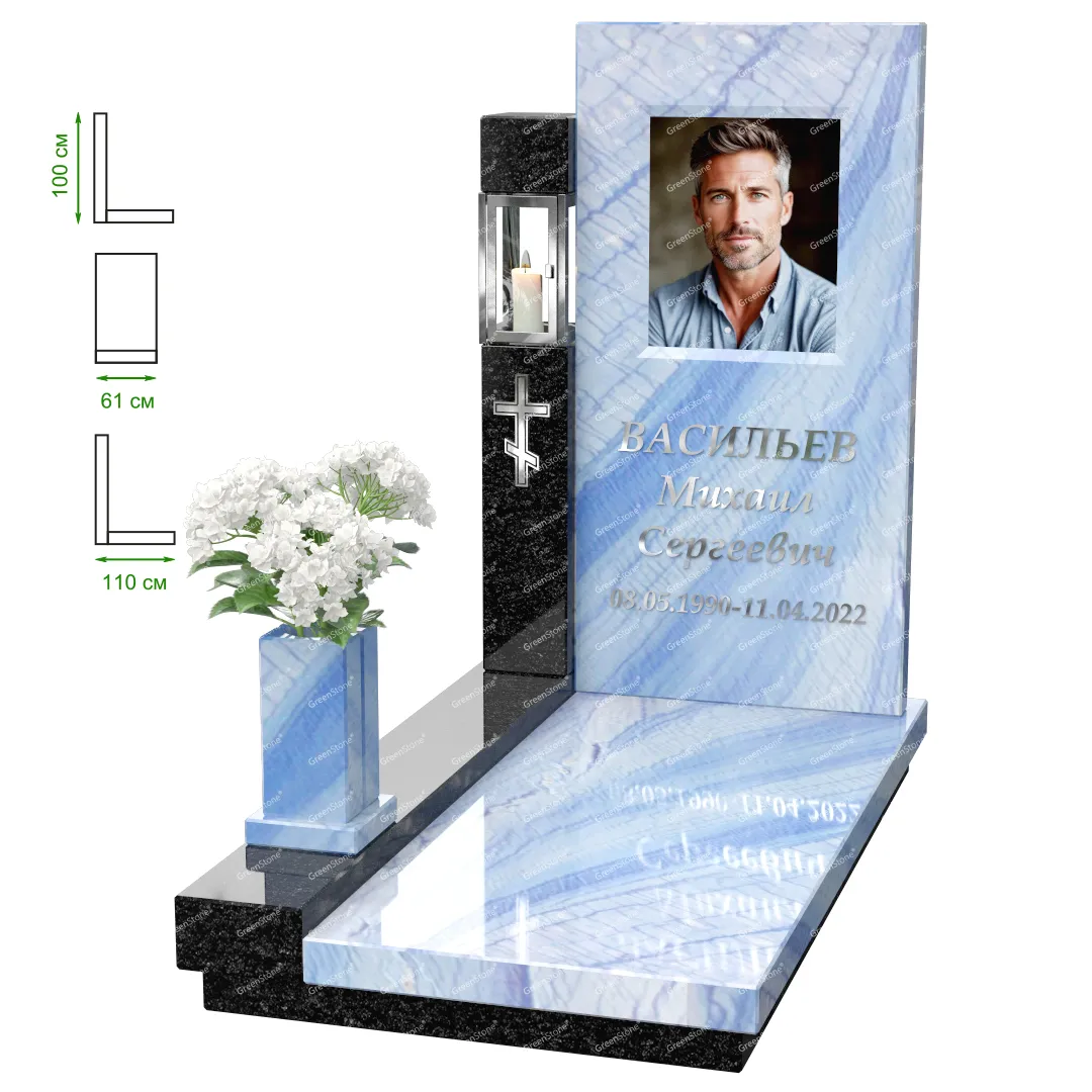Визуально комплекс отличается от типовой формы не только формой, но и размерами. Массивная стела позволяет дизайнеру реализовать практически любые задумки и пожелания Заказчика, придать готовому изделию солидный вид, раскрыть все достоинства использованного в его изготовлении гранита. Такой габаритный памятник требует профессиональной доставки и установки. Все это также можно заказать в мастерской Грин-Стоун.