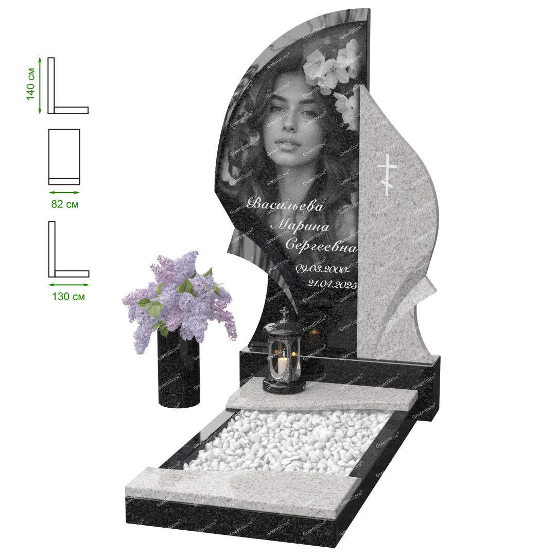 Визуально комплекс отличается от типовой формы не только формой, но и размерами. Массивная стела позволяет дизайнеру реализовать практически любые задумки и пожелания Заказчика, придать готовому изделию солидный вид, раскрыть все достоинства использованного в его изготовлении гранита. Такой габаритный памятник требует профессиональной доставки и установки. Все это также можно заказать в мастерской Грин-Стоун.