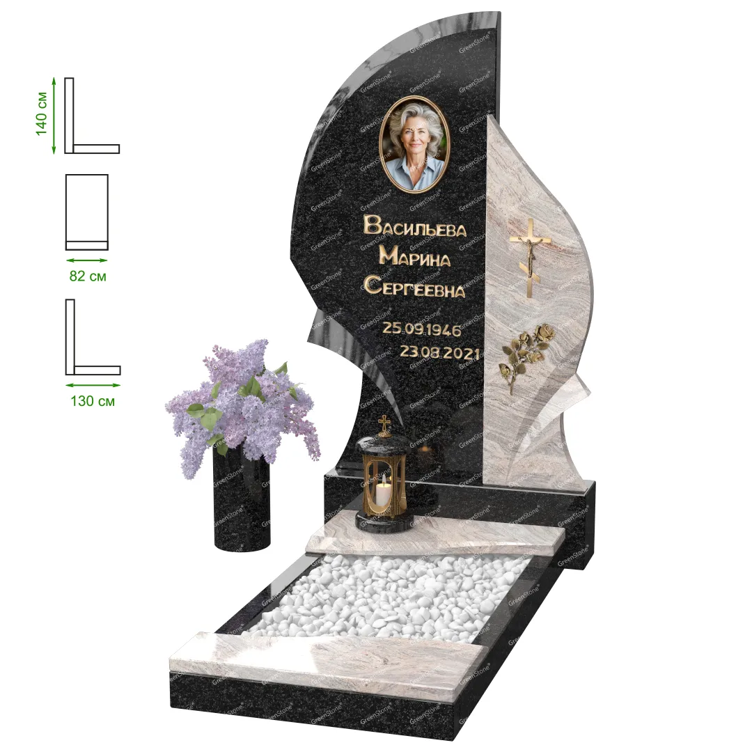Визуально комплекс отличается от типовой формы не только формой, но и размерами. Массивная стела позволяет дизайнеру реализовать практически любые задумки и пожелания Заказчика, придать готовому изделию солидный вид, раскрыть все достоинства использованного в его изготовлении гранита. Такой габаритный памятник требует профессиональной доставки и установки. Все это также можно заказать в мастерской Грин-Стоун.