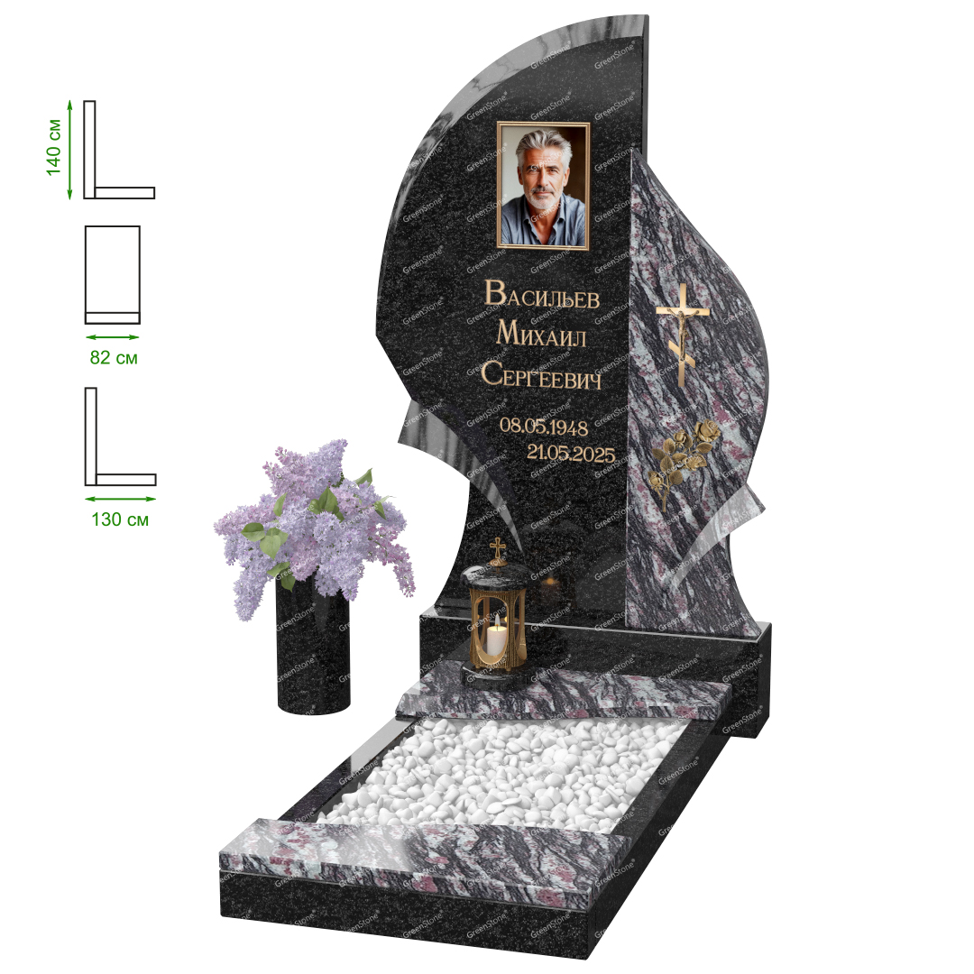 Визуально комплекс отличается от типовой формы не только формой, но и размерами. Массивная стела позволяет дизайнеру реализовать практически любые задумки и пожелания Заказчика, придать готовому изделию солидный вид, раскрыть все достоинства использованного в его изготовлении гранита. Такой габаритный памятник требует профессиональной доставки и установки. Все это также можно заказать в мастерской Грин-Стоун.