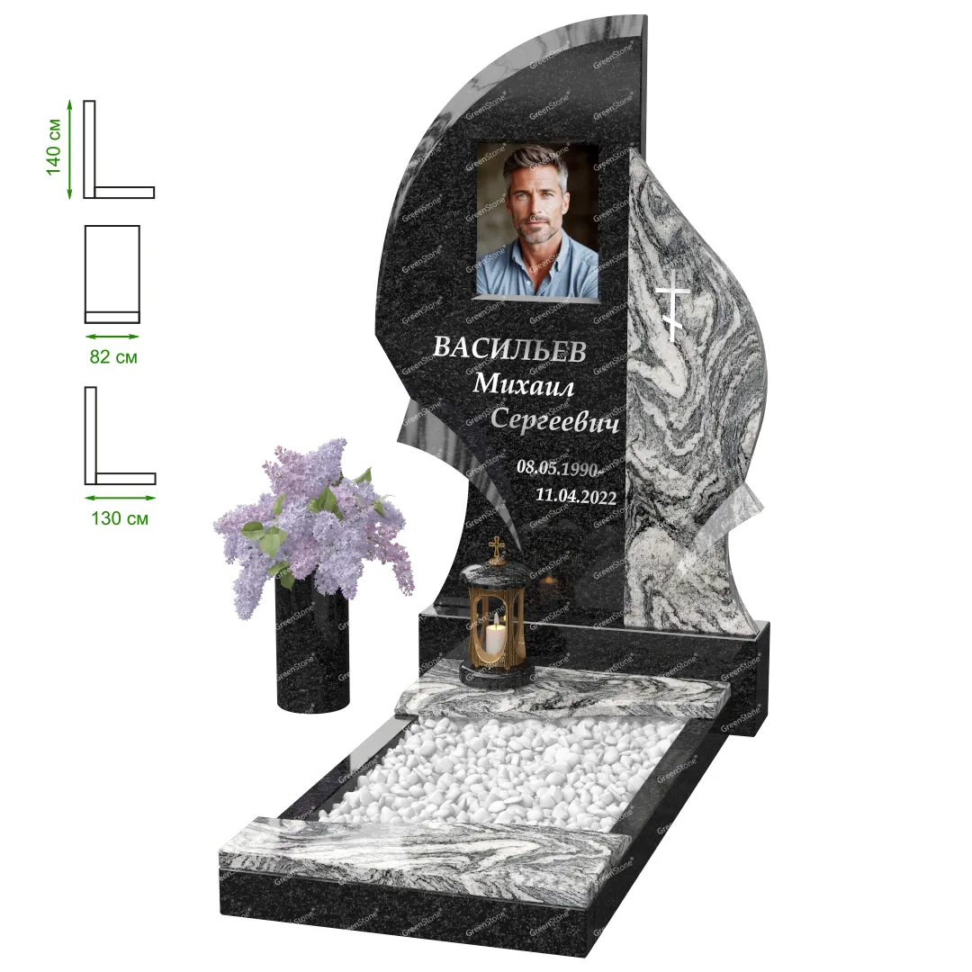 Визуально комплекс отличается от типовой формы не только формой, но и размерами. Массивная стела позволяет дизайнеру реализовать практически любые задумки и пожелания Заказчика, придать готовому изделию солидный вид, раскрыть все достоинства использованного в его изготовлении гранита. Такой габаритный памятник требует профессиональной доставки и установки. Все это также можно заказать в мастерской Грин-Стоун.
