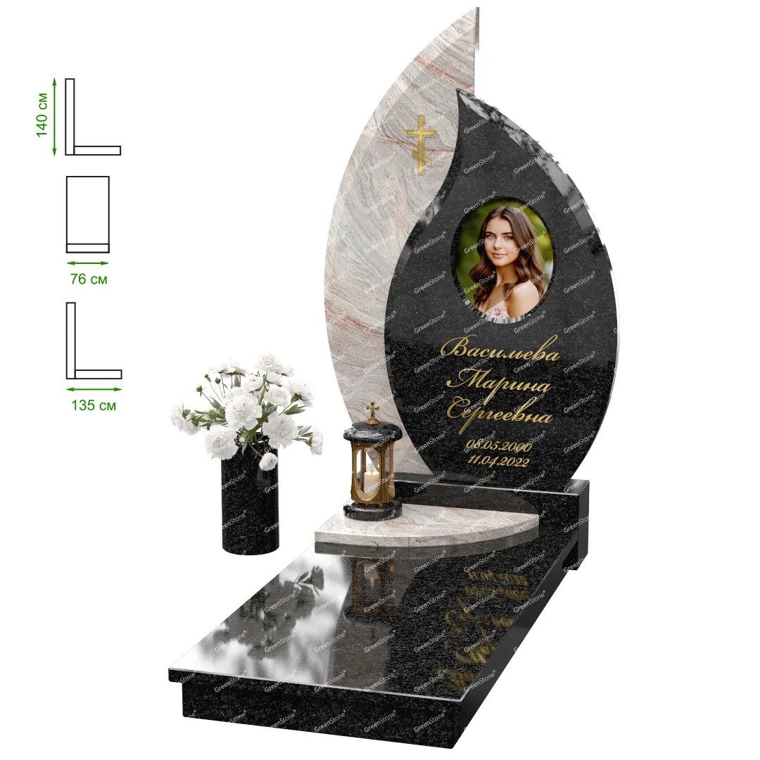 Визуально комплекс отличается от типовой формы не только формой, но и размерами. Массивная стела позволяет дизайнеру реализовать практически любые задумки и пожелания Заказчика, придать готовому изделию солидный вид, раскрыть все достоинства использованного в его изготовлении гранита. Такой габаритный памятник требует профессиональной доставки и установки. Все это также можно заказать в мастерской Грин-Стоун.