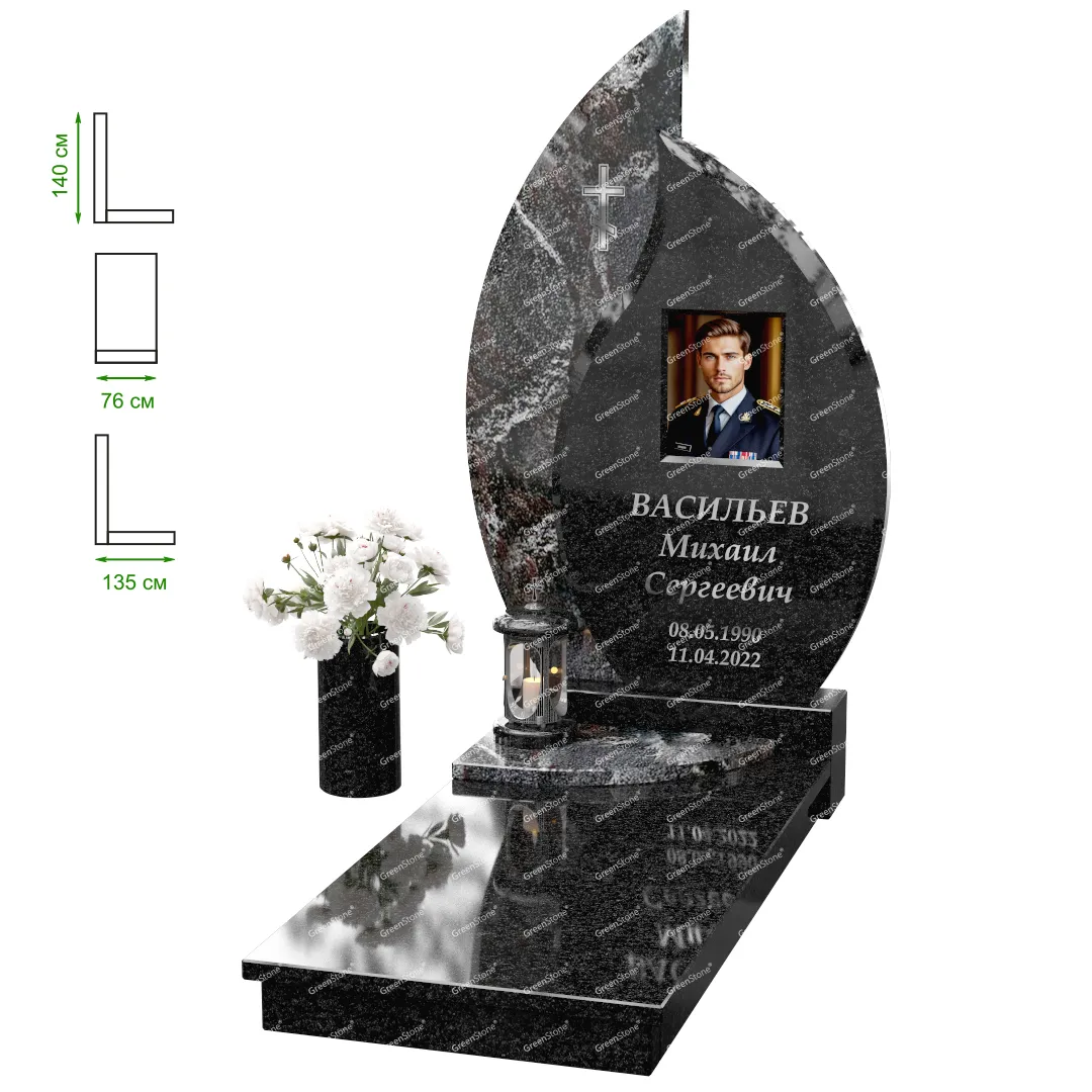 Визуально комплекс отличается от типовой формы не только формой, но и размерами. Массивная стела позволяет дизайнеру реализовать практически любые задумки и пожелания Заказчика, придать готовому изделию солидный вид, раскрыть все достоинства использованного в его изготовлении гранита. Такой габаритный памятник требует профессиональной доставки и установки. Все это также можно заказать в мастерской Грин-Стоун.