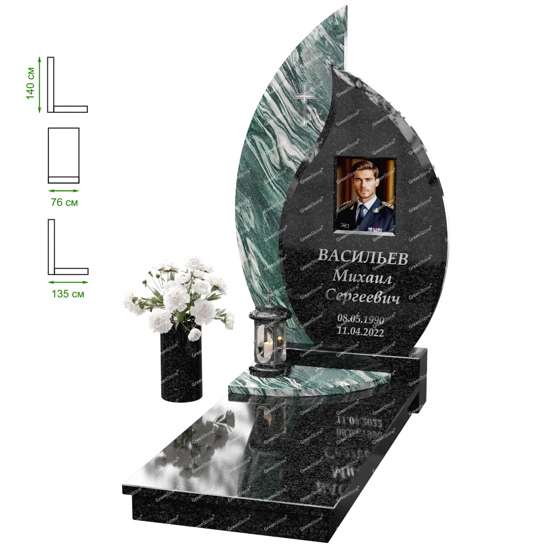 Визуально комплекс отличается от типовой формы не только формой, но и размерами. Массивная стела позволяет дизайнеру реализовать практически любые задумки и пожелания Заказчика, придать готовому изделию солидный вид, раскрыть все достоинства использованного в его изготовлении гранита. Такой габаритный памятник требует профессиональной доставки и установки. Все это также можно заказать в мастерской Грин-Стоун.