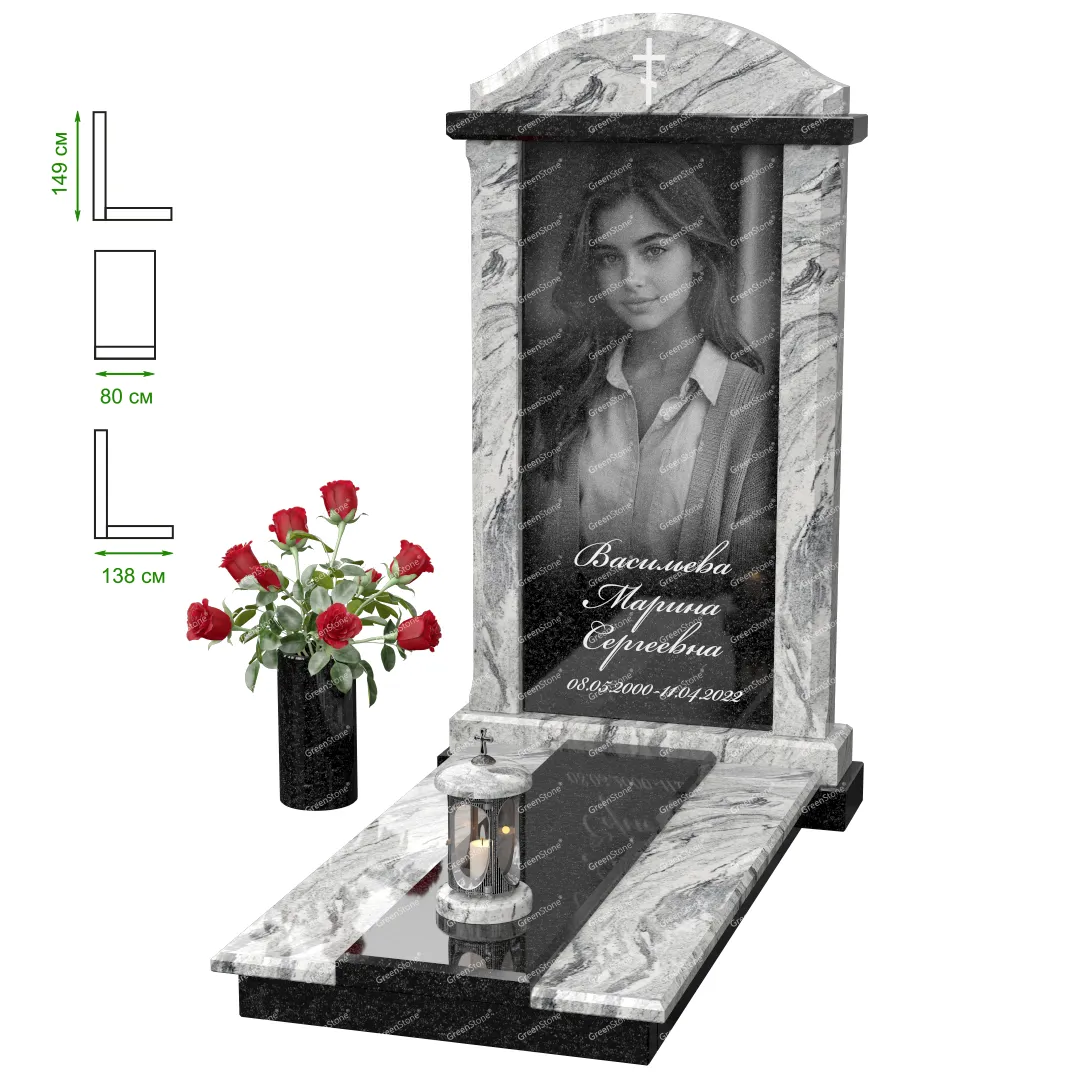 Визуально комплекс отличается от типовой формы не только формой, но и размерами. Массивная стела позволяет дизайнеру реализовать практически любые задумки и пожелания Заказчика, придать готовому изделию солидный вид, раскрыть все достоинства использованного в его изготовлении гранита. Такой габаритный памятник требует профессиональной доставки и установки. Все это также можно заказать в мастерской Грин-Стоун.