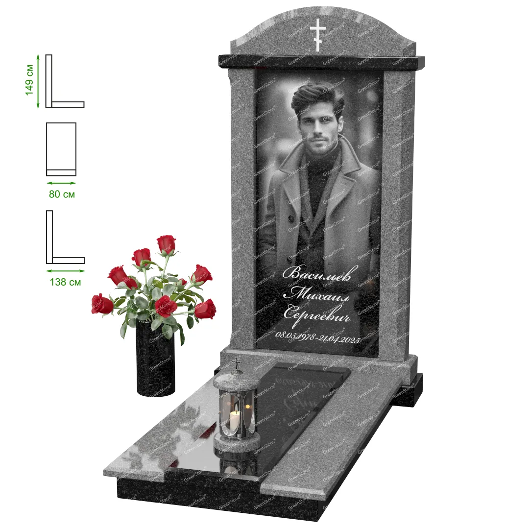Визуально комплекс отличается от типовой формы не только формой, но и размерами. Массивная стела позволяет дизайнеру реализовать практически любые задумки и пожелания Заказчика, придать готовому изделию солидный вид, раскрыть все достоинства использованного в его изготовлении гранита. Такой габаритный памятник требует профессиональной доставки и установки. Все это также можно заказать в мастерской Грин-Стоун.