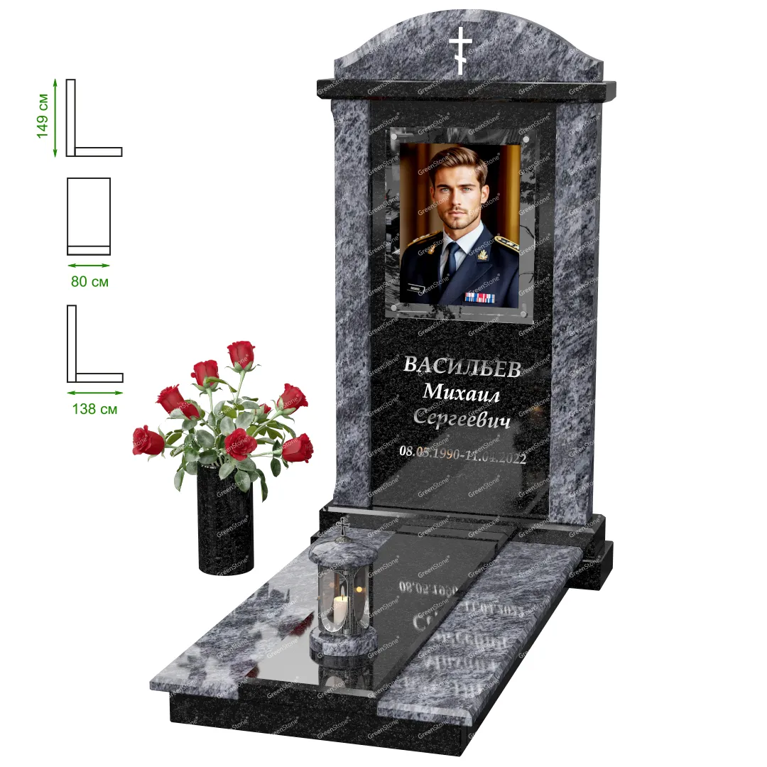 Визуально комплекс отличается от типовой формы не только формой, но и размерами. Массивная стела позволяет дизайнеру реализовать практически любые задумки и пожелания Заказчика, придать готовому изделию солидный вид, раскрыть все достоинства использованного в его изготовлении гранита. Такой габаритный памятник требует профессиональной доставки и установки. Все это также можно заказать в мастерской Грин-Стоун.