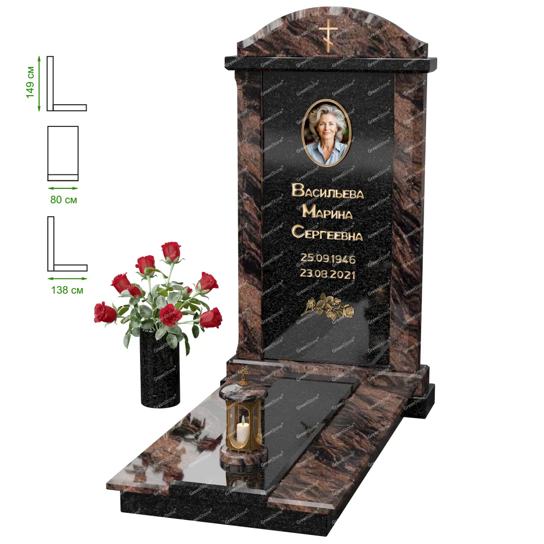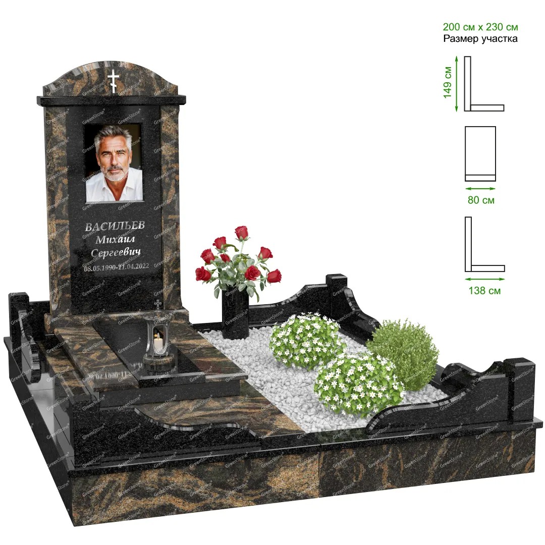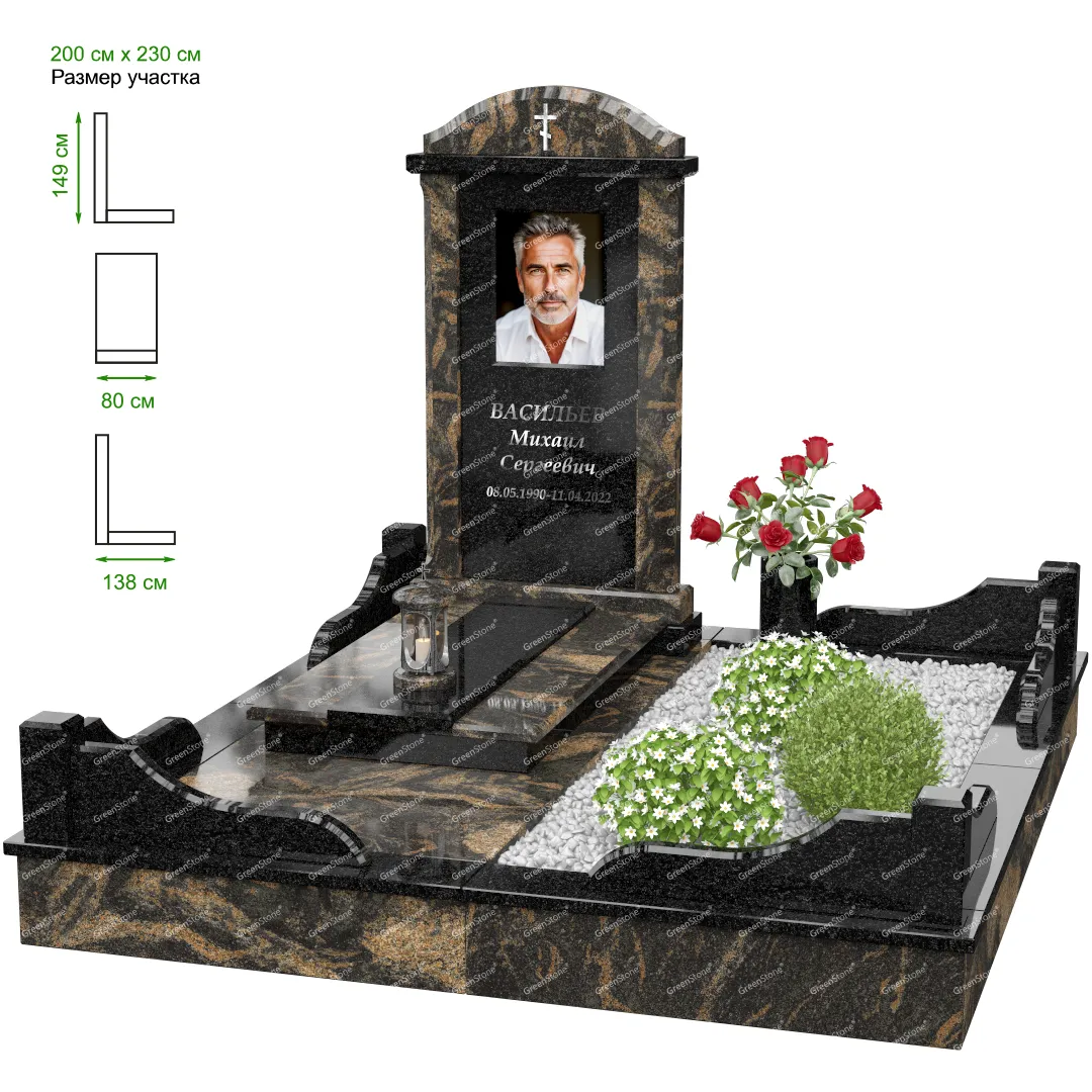 Визуально комплекс отличается от типовой формы не только формой, но и размерами. Массивная стела позволяет дизайнеру реализовать практически любые задумки и пожелания Заказчика, придать готовому изделию солидный вид, раскрыть все достоинства использованного в его изготовлении гранита. Такой габаритный памятник требует профессиональной доставки и установки. Все это также можно заказать в мастерской Грин-Стоун.