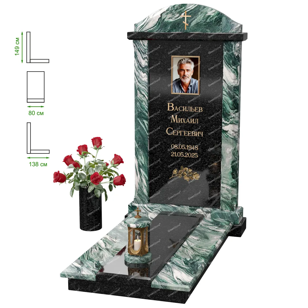 Визуально комплекс отличается от типовой формы не только формой, но и размерами. Массивная стела позволяет дизайнеру реализовать практически любые задумки и пожелания Заказчика, придать готовому изделию солидный вид, раскрыть все достоинства использованного в его изготовлении гранита. Такой габаритный памятник требует профессиональной доставки и установки. Все это также можно заказать в мастерской Грин-Стоун.