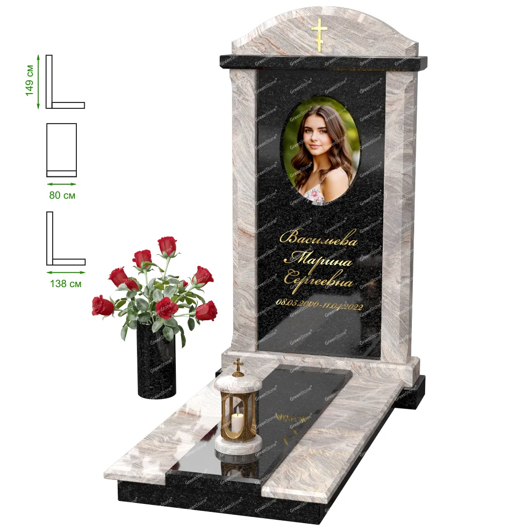 Визуально комплекс отличается от типовой формы не только формой, но и размерами. Массивная стела позволяет дизайнеру реализовать практически любые задумки и пожелания Заказчика, придать готовому изделию солидный вид, раскрыть все достоинства использованного в его изготовлении гранита. Такой габаритный памятник требует профессиональной доставки и установки. Все это также можно заказать в мастерской Грин-Стоун.