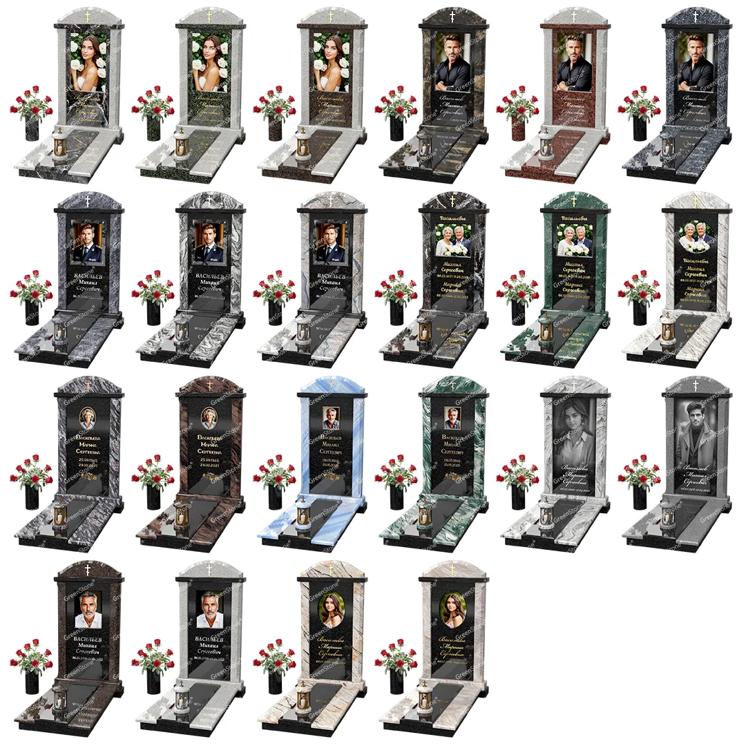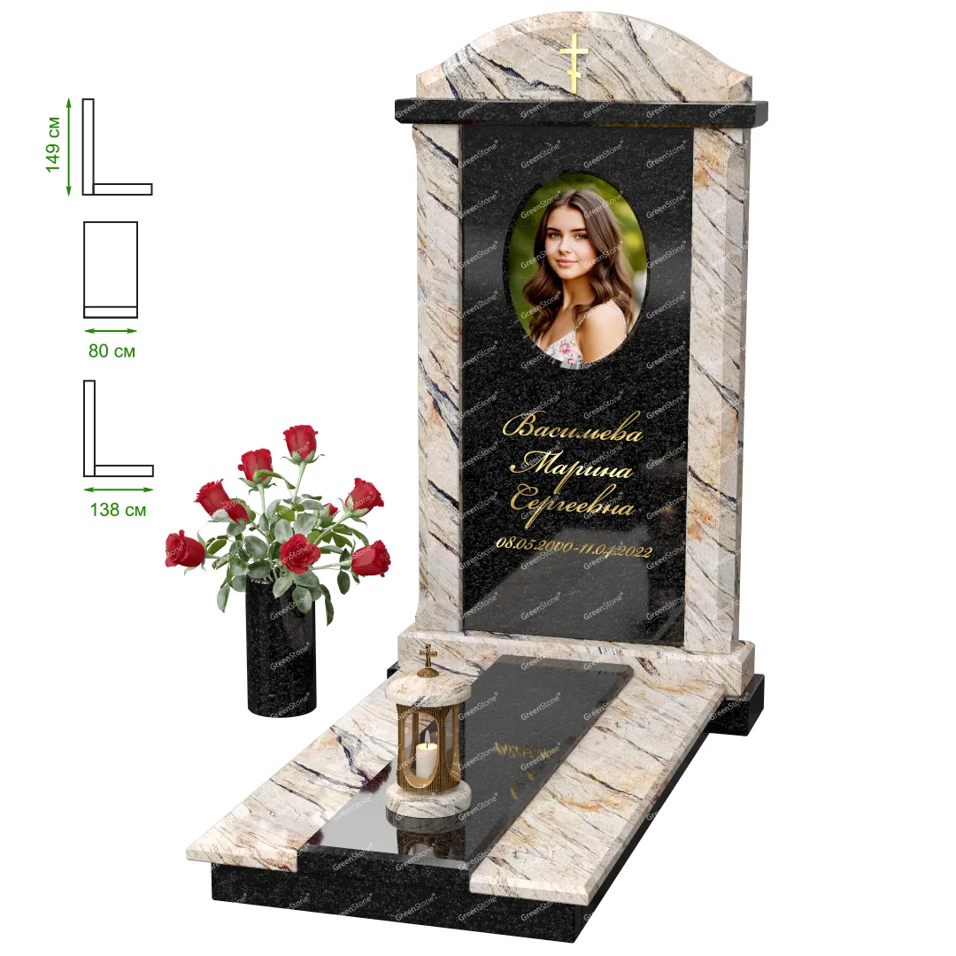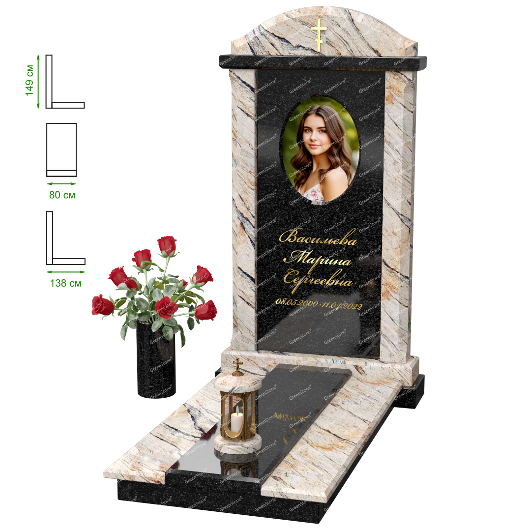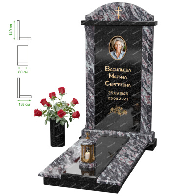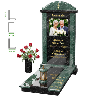 Визуально комплекс отличается от типовой формы не только формой, но и размерами. Массивная стела позволяет дизайнеру реализовать практически любые задумки и пожелания Заказчика, придать готовому изделию солидный вид, раскрыть все достоинства использованного в его изготовлении гранита. Такой габаритный памятник требует профессиональной доставки и установки. Все это также можно заказать в мастерской Грин-Стоун.