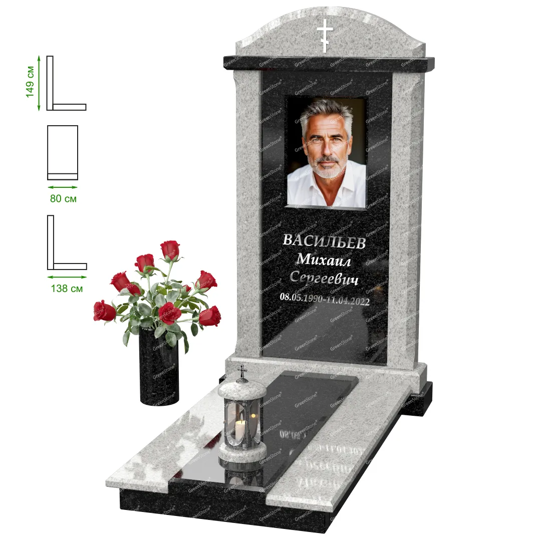 Визуально комплекс отличается от типовой формы не только формой, но и размерами. Массивная стела позволяет дизайнеру реализовать практически любые задумки и пожелания Заказчика, придать готовому изделию солидный вид, раскрыть все достоинства использованного в его изготовлении гранита. Такой габаритный памятник требует профессиональной доставки и установки. Все это также можно заказать в мастерской Грин-Стоун.