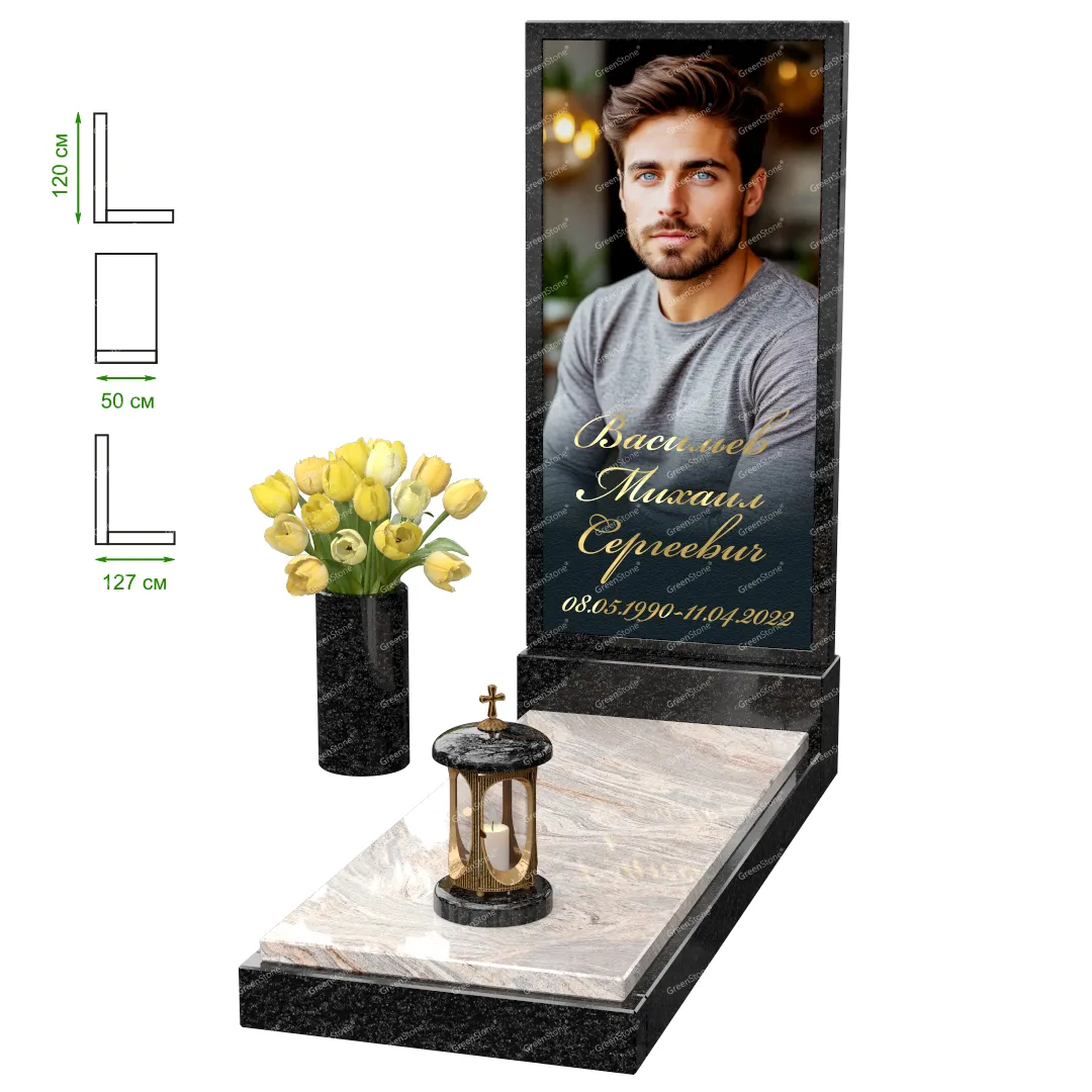 Визуально комплекс отличается от типовой формы не только формой, но и размерами. Массивная стела позволяет дизайнеру реализовать практически любые задумки и пожелания Заказчика, придать готовому изделию солидный вид, раскрыть все достоинства использованного в его изготовлении гранита. Такой габаритный памятник требует профессиональной доставки и установки. Все это также можно заказать в мастерской Грин-Стоун.