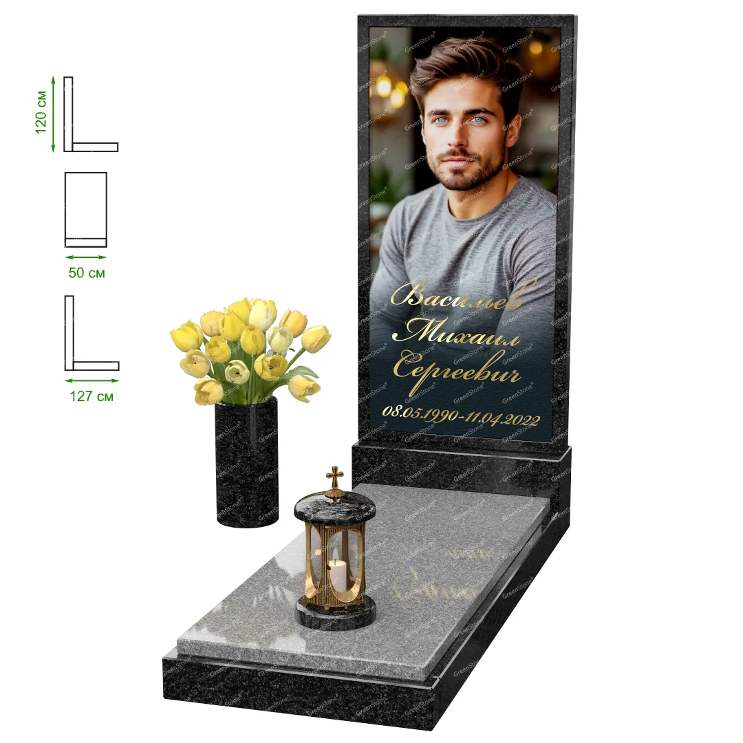 Визуально комплекс отличается от типовой формы не только формой, но и размерами. Массивная стела позволяет дизайнеру реализовать практически любые задумки и пожелания Заказчика, придать готовому изделию солидный вид, раскрыть все достоинства использованного в его изготовлении гранита. Такой габаритный памятник требует профессиональной доставки и установки. Все это также можно заказать в мастерской Грин-Стоун.