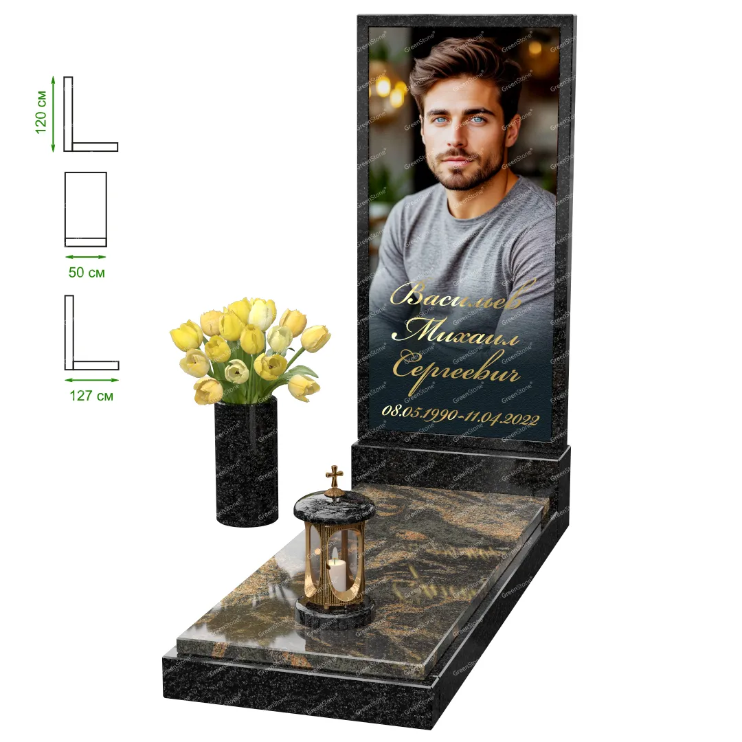 Визуально комплекс отличается от типовой формы не только формой, но и размерами. Массивная стела позволяет дизайнеру реализовать практически любые задумки и пожелания Заказчика, придать готовому изделию солидный вид, раскрыть все достоинства использованного в его изготовлении гранита. Такой габаритный памятник требует профессиональной доставки и установки. Все это также можно заказать в мастерской Грин-Стоун.