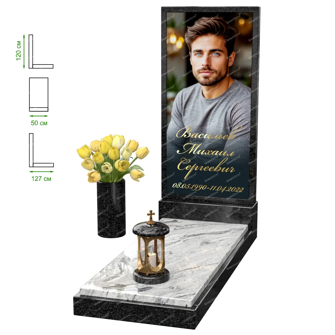 Визуально комплекс отличается от типовой формы не только формой, но и размерами. Массивная стела позволяет дизайнеру реализовать практически любые задумки и пожелания Заказчика, придать готовому изделию солидный вид, раскрыть все достоинства использованного в его изготовлении гранита. Такой габаритный памятник требует профессиональной доставки и установки. Все это также можно заказать в мастерской Грин-Стоун.