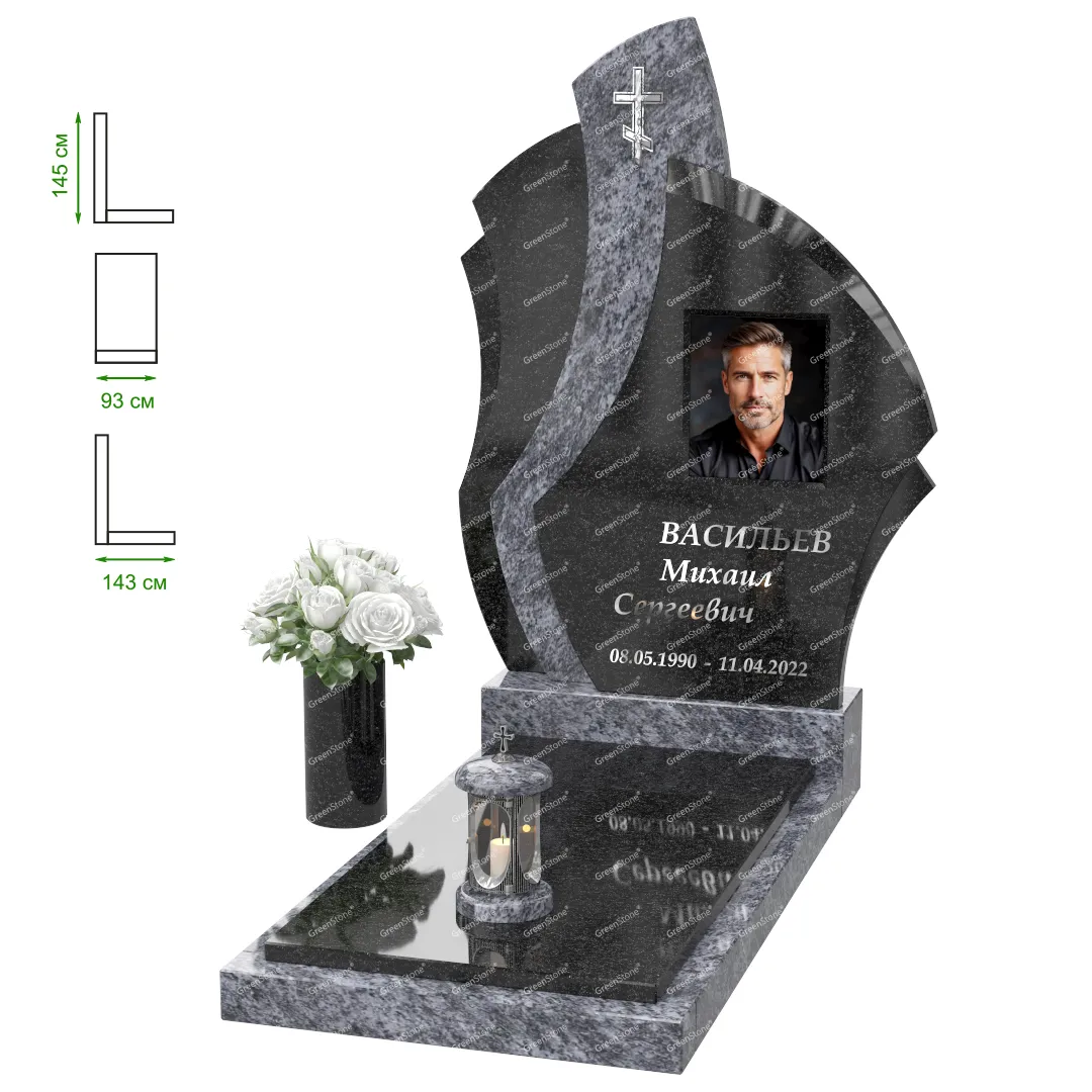 Визуально комплекс отличается от типовой формы не только формой, но и размерами. Массивная стела позволяет дизайнеру реализовать практически любые задумки и пожелания Заказчика, придать готовому изделию солидный вид, раскрыть все достоинства использованного в его изготовлении гранита. Такой габаритный памятник требует профессиональной доставки и установки. Все это также можно заказать в мастерской Грин-Стоун.