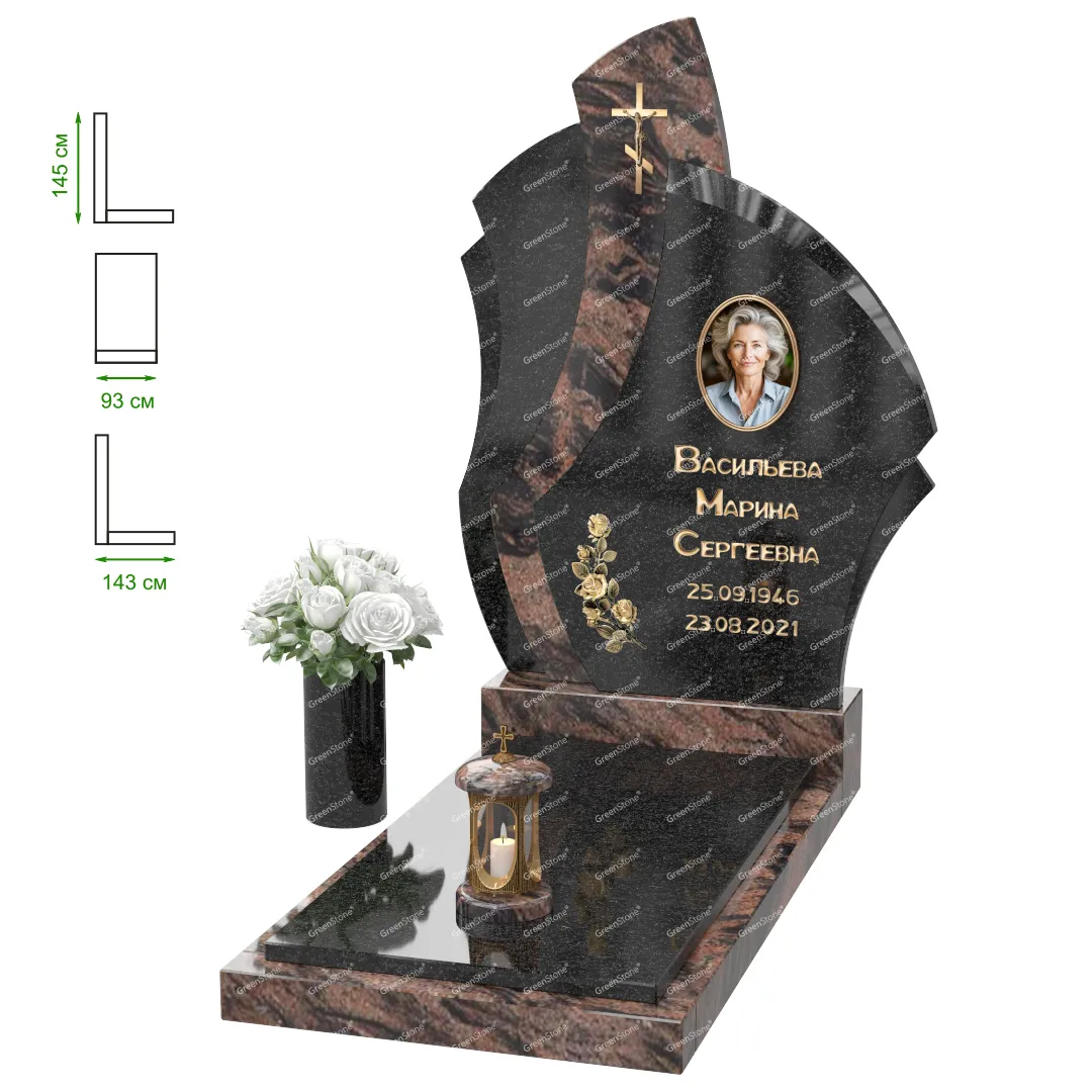 Визуально комплекс отличается от типовой формы не только формой, но и размерами. Массивная стела позволяет дизайнеру реализовать практически любые задумки и пожелания Заказчика, придать готовому изделию солидный вид, раскрыть все достоинства использованного в его изготовлении гранита. Такой габаритный памятник требует профессиональной доставки и установки. Все это также можно заказать в мастерской Грин-Стоун.