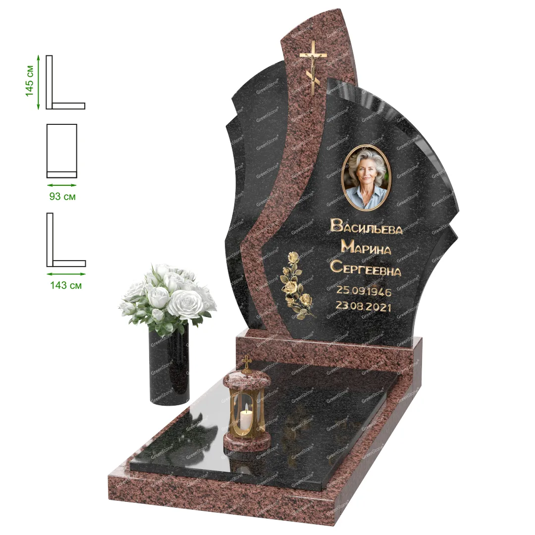 Визуально комплекс отличается от типовой формы не только формой, но и размерами. Массивная стела позволяет дизайнеру реализовать практически любые задумки и пожелания Заказчика, придать готовому изделию солидный вид, раскрыть все достоинства использованного в его изготовлении гранита. Такой габаритный памятник требует профессиональной доставки и установки. Все это также можно заказать в мастерской Грин-Стоун.