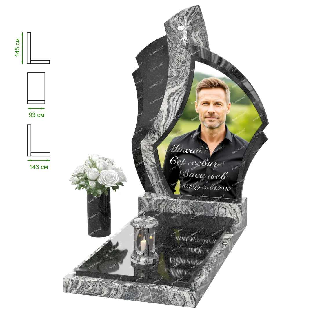 Визуально комплекс отличается от типовой формы не только формой, но и размерами. Массивная стела позволяет дизайнеру реализовать практически любые задумки и пожелания Заказчика, придать готовому изделию солидный вид, раскрыть все достоинства использованного в его изготовлении гранита. Такой габаритный памятник требует профессиональной доставки и установки. Все это также можно заказать в мастерской Грин-Стоун.