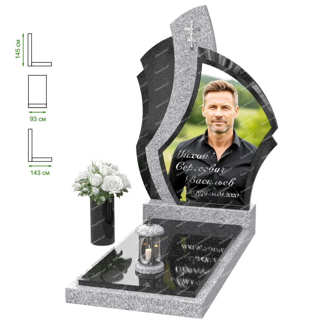 Визуально комплекс отличается от типовой формы не только формой, но и размерами. Массивная стела позволяет дизайнеру реализовать практически любые задумки и пожелания Заказчика, придать готовому изделию солидный вид, раскрыть все достоинства использованного в его изготовлении гранита. Такой габаритный памятник требует профессиональной доставки и установки. Все это также можно заказать в мастерской Грин-Стоун.