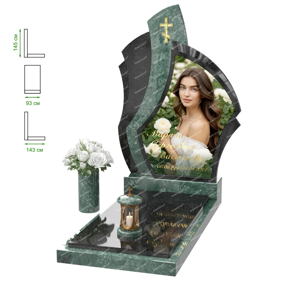 Визуально комплекс отличается от типовой формы не только формой, но и размерами. Массивная стела позволяет дизайнеру реализовать практически любые задумки и пожелания Заказчика, придать готовому изделию солидный вид, раскрыть все достоинства использованного в его изготовлении гранита. Такой габаритный памятник требует профессиональной доставки и установки. Все это также можно заказать в мастерской Грин-Стоун.