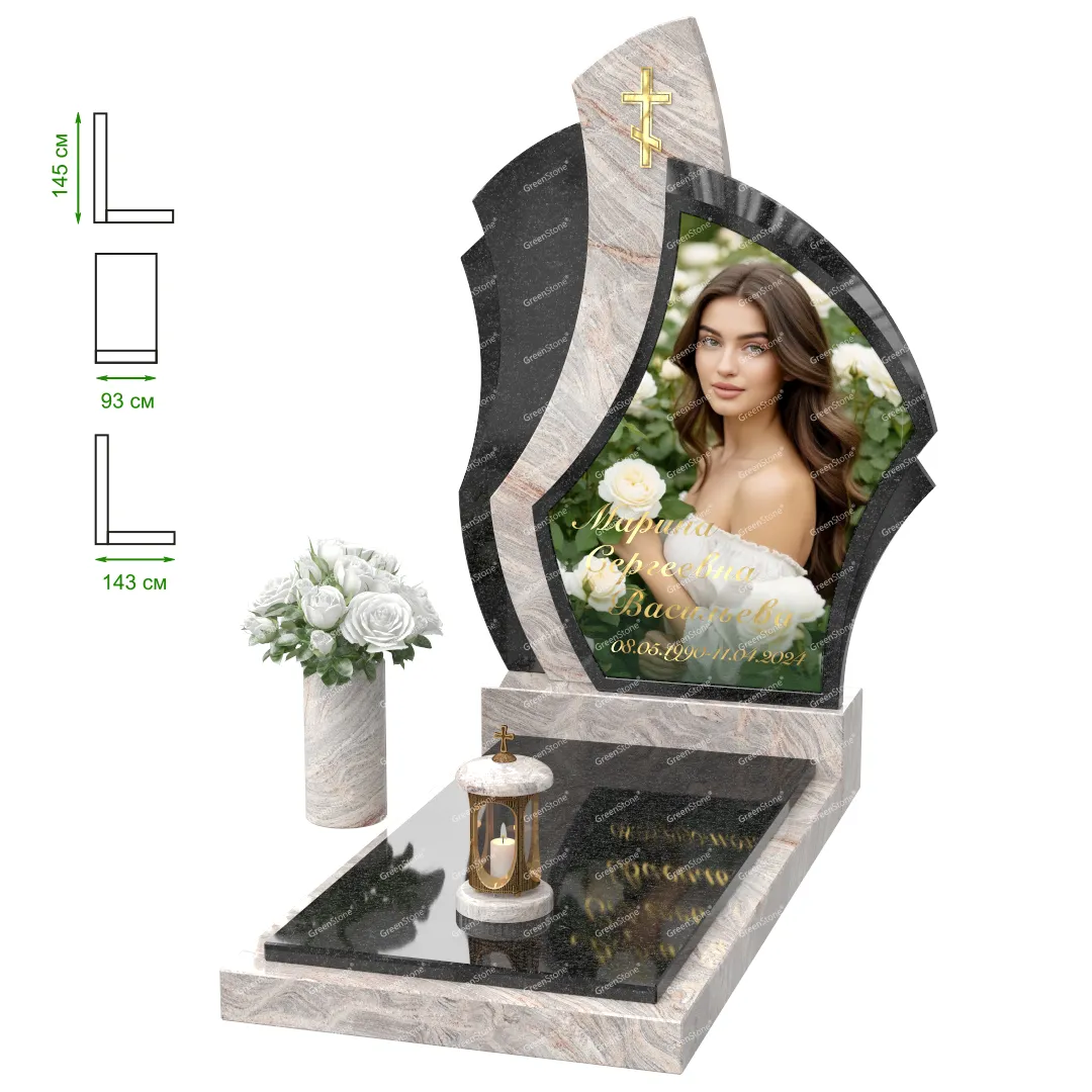 Визуально комплекс отличается от типовой формы не только формой, но и размерами. Массивная стела позволяет дизайнеру реализовать практически любые задумки и пожелания Заказчика, придать готовому изделию солидный вид, раскрыть все достоинства использованного в его изготовлении гранита. Такой габаритный памятник требует профессиональной доставки и установки. Все это также можно заказать в мастерской Грин-Стоун.