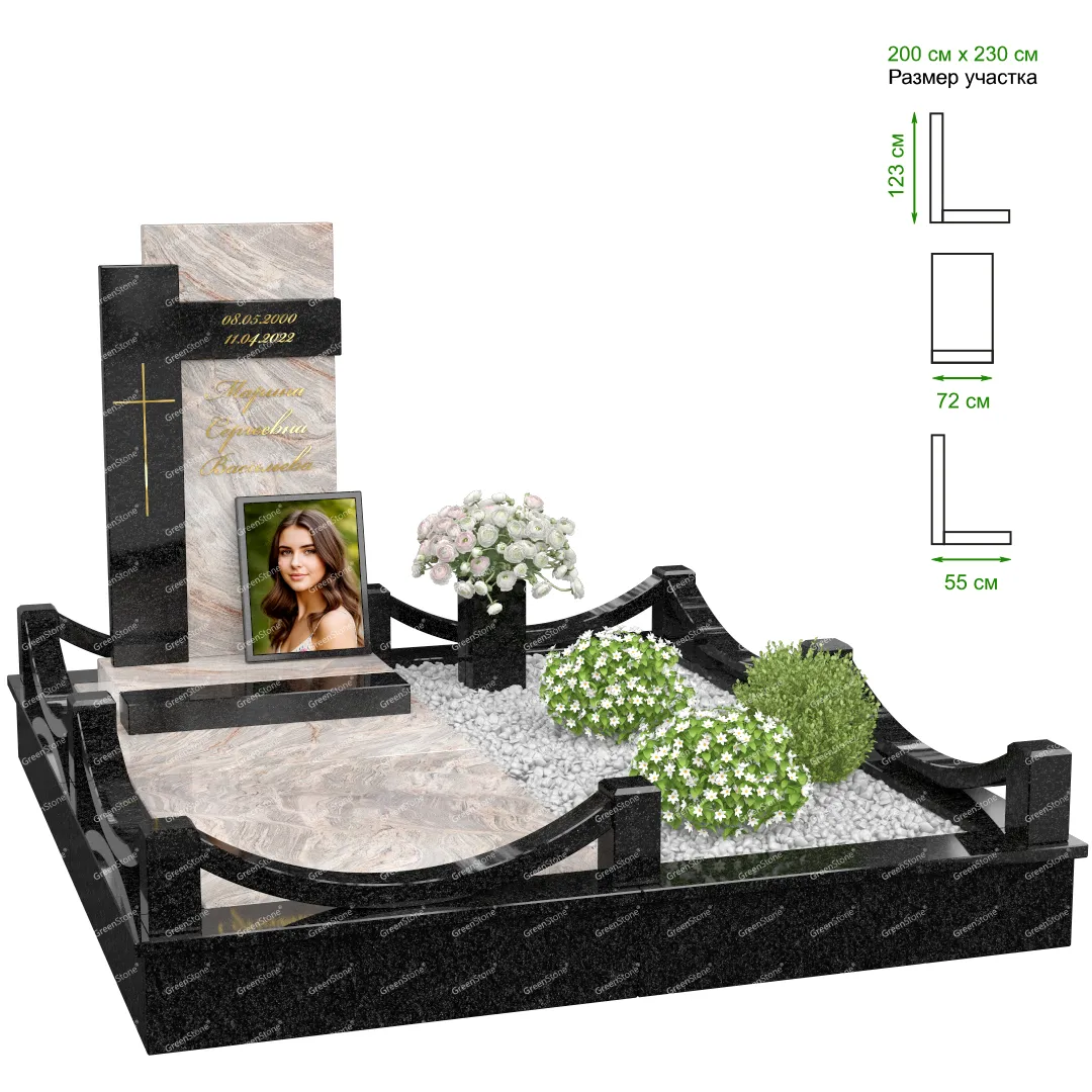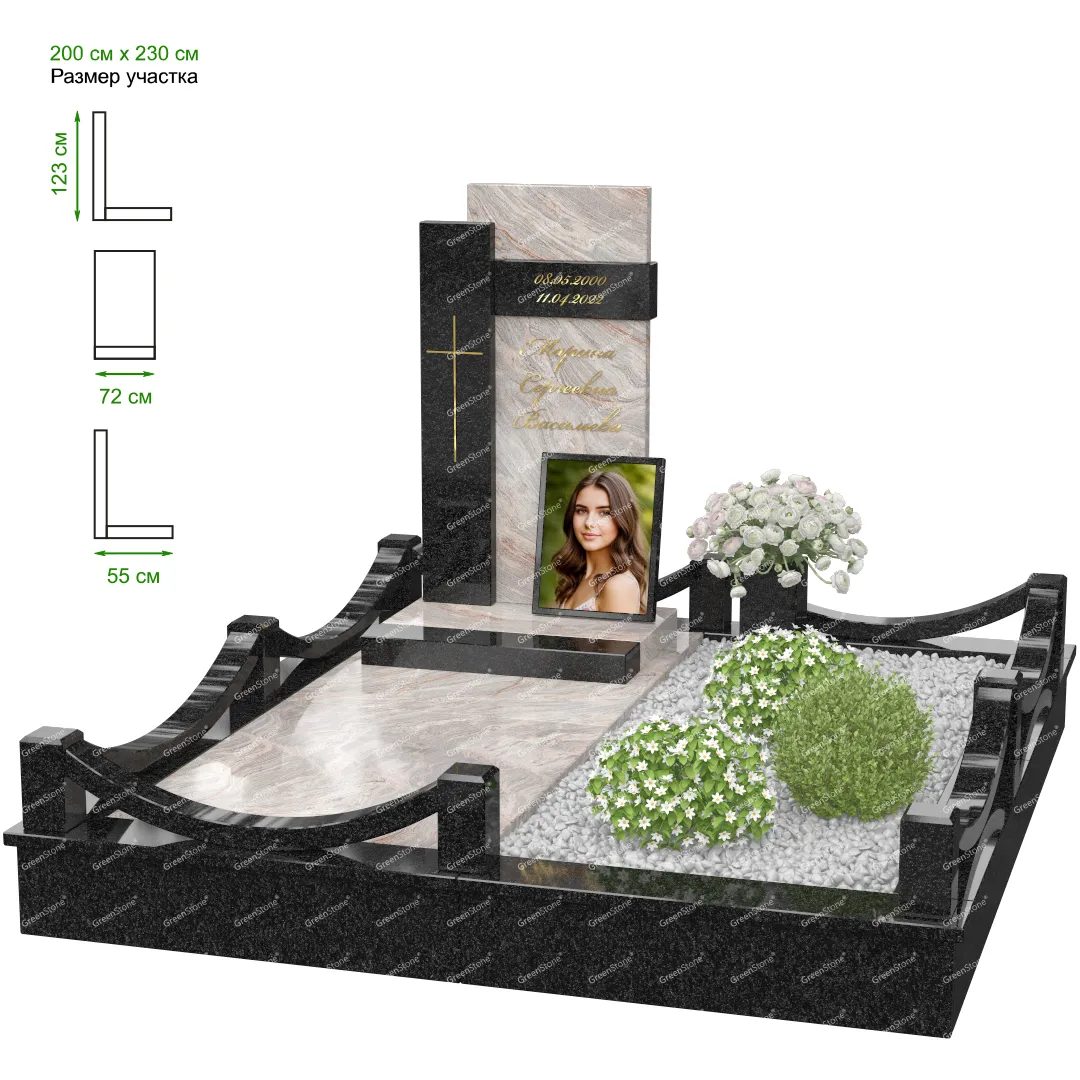Визуально комплекс отличается от типовой формы не только формой, но и размерами. Массивная стела позволяет дизайнеру реализовать практически любые задумки и пожелания Заказчика, придать готовому изделию солидный вид, раскрыть все достоинства использованного в его изготовлении гранита. Такой габаритный памятник требует профессиональной доставки и установки. Все это также можно заказать в мастерской Грин-Стоун.