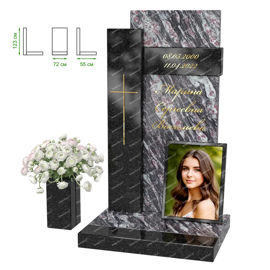 Визуально комплекс отличается от типовой формы не только формой, но и размерами. Массивная стела позволяет дизайнеру реализовать практически любые задумки и пожелания Заказчика, придать готовому изделию солидный вид, раскрыть все достоинства использованного в его изготовлении гранита. Такой габаритный памятник требует профессиональной доставки и установки. Все это также можно заказать в мастерской Грин-Стоун.