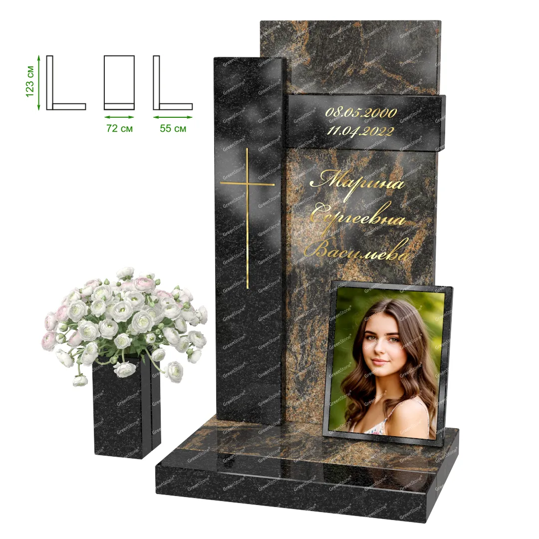 Визуально комплекс отличается от типовой формы не только формой, но и размерами. Массивная стела позволяет дизайнеру реализовать практически любые задумки и пожелания Заказчика, придать готовому изделию солидный вид, раскрыть все достоинства использованного в его изготовлении гранита. Такой габаритный памятник требует профессиональной доставки и установки. Все это также можно заказать в мастерской Грин-Стоун.