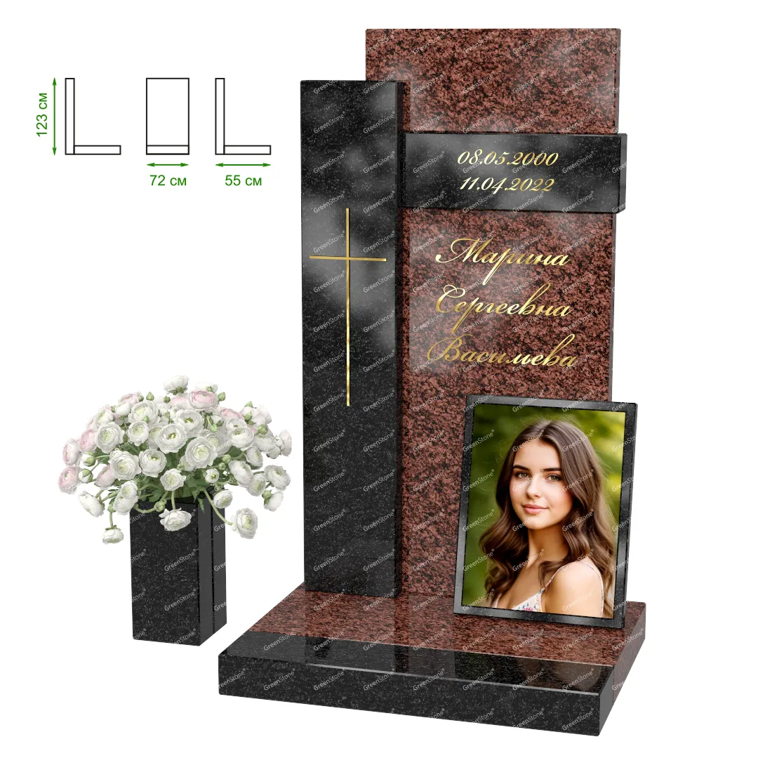 Визуально комплекс отличается от типовой формы не только формой, но и размерами. Массивная стела позволяет дизайнеру реализовать практически любые задумки и пожелания Заказчика, придать готовому изделию солидный вид, раскрыть все достоинства использованного в его изготовлении гранита. Такой габаритный памятник требует профессиональной доставки и установки. Все это также можно заказать в мастерской Грин-Стоун.