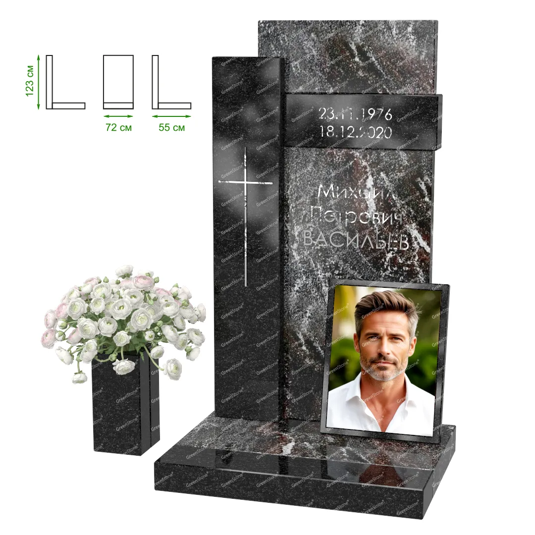 Визуально комплекс отличается от типовой формы не только формой, но и размерами. Массивная стела позволяет дизайнеру реализовать практически любые задумки и пожелания Заказчика, придать готовому изделию солидный вид, раскрыть все достоинства использованного в его изготовлении гранита. Такой габаритный памятник требует профессиональной доставки и установки. Все это также можно заказать в мастерской Грин-Стоун.