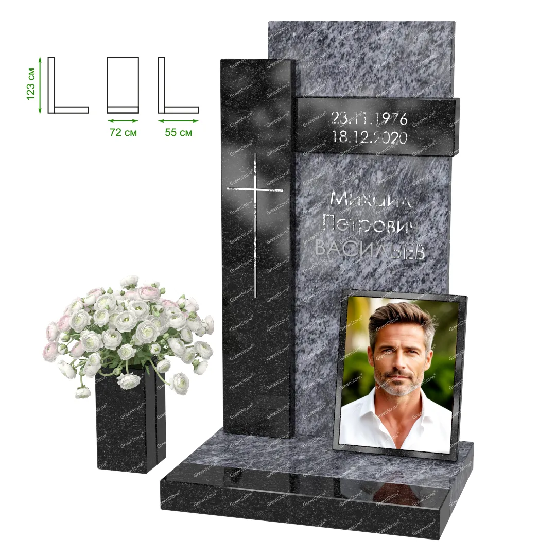 Визуально комплекс отличается от типовой формы не только формой, но и размерами. Массивная стела позволяет дизайнеру реализовать практически любые задумки и пожелания Заказчика, придать готовому изделию солидный вид, раскрыть все достоинства использованного в его изготовлении гранита. Такой габаритный памятник требует профессиональной доставки и установки. Все это также можно заказать в мастерской Грин-Стоун.