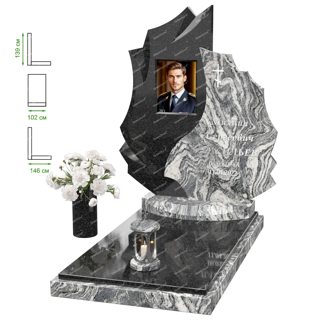 Визуально комплекс отличается от типовой формы не только формой, но и размерами. Массивная стела позволяет дизайнеру реализовать практически любые задумки и пожелания Заказчика, придать готовому изделию солидный вид, раскрыть все достоинства использованного в его изготовлении гранита. Такой габаритный памятник требует профессиональной доставки и установки. Все это также можно заказать в мастерской Грин-Стоун.