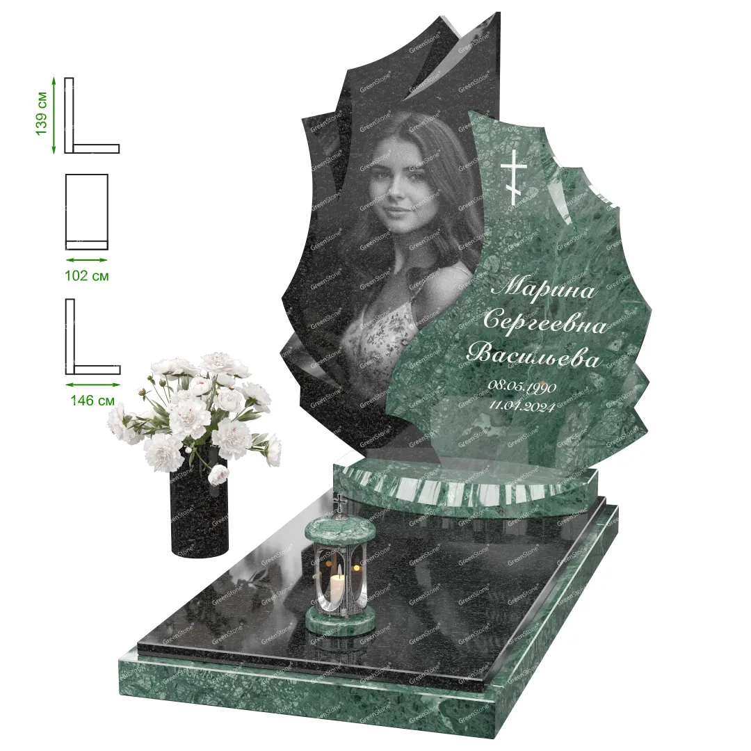 Визуально комплекс отличается от типовой формы не только формой, но и размерами. Массивная стела позволяет дизайнеру реализовать практически любые задумки и пожелания Заказчика, придать готовому изделию солидный вид, раскрыть все достоинства использованного в его изготовлении гранита. Такой габаритный памятник требует профессиональной доставки и установки. Все это также можно заказать в мастерской Грин-Стоун.