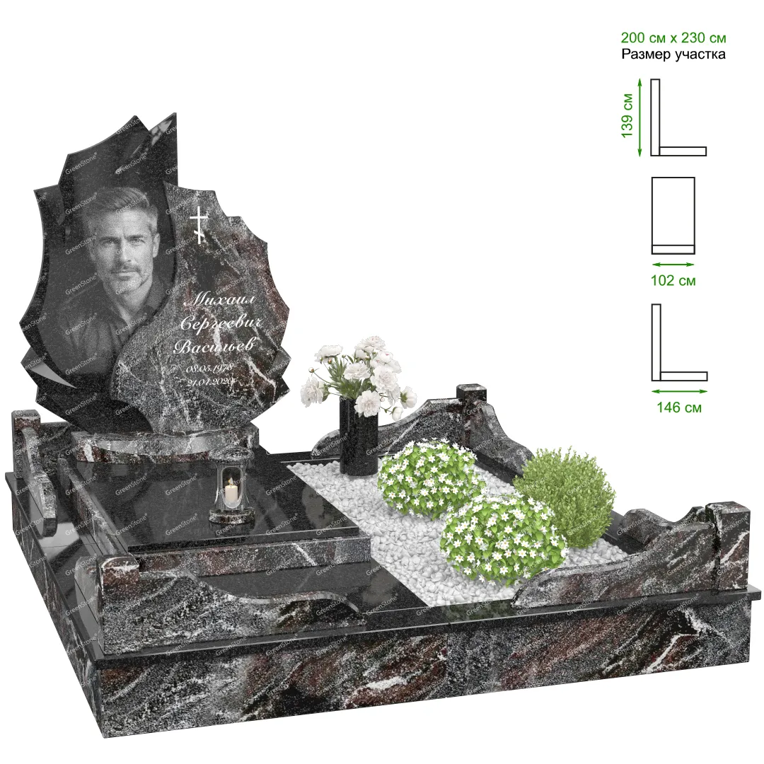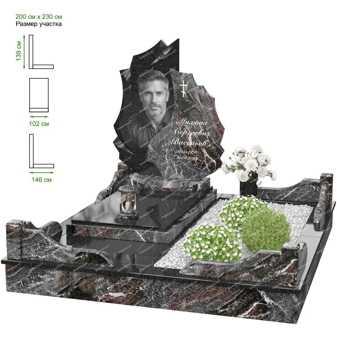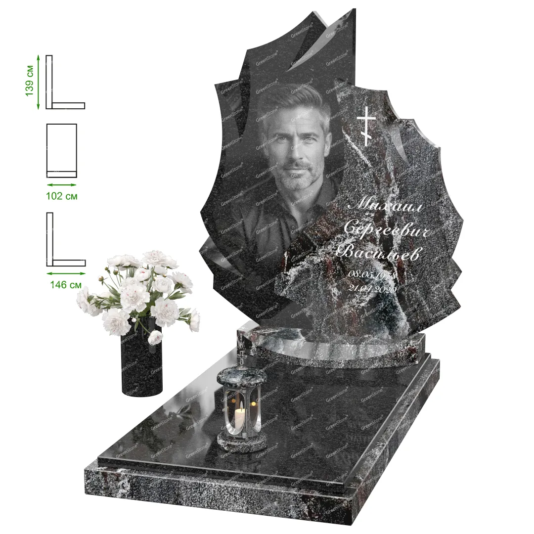 Визуально комплекс отличается от типовой формы не только формой, но и размерами. Массивная стела позволяет дизайнеру реализовать практически любые задумки и пожелания Заказчика, придать готовому изделию солидный вид, раскрыть все достоинства использованного в его изготовлении гранита. Такой габаритный памятник требует профессиональной доставки и установки. Все это также можно заказать в мастерской Грин-Стоун.