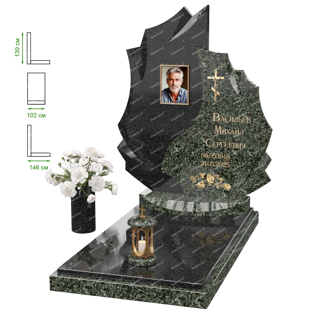 Визуально комплекс отличается от типовой формы не только формой, но и размерами. Массивная стела позволяет дизайнеру реализовать практически любые задумки и пожелания Заказчика, придать готовому изделию солидный вид, раскрыть все достоинства использованного в его изготовлении гранита. Такой габаритный памятник требует профессиональной доставки и установки. Все это также можно заказать в мастерской Грин-Стоун.