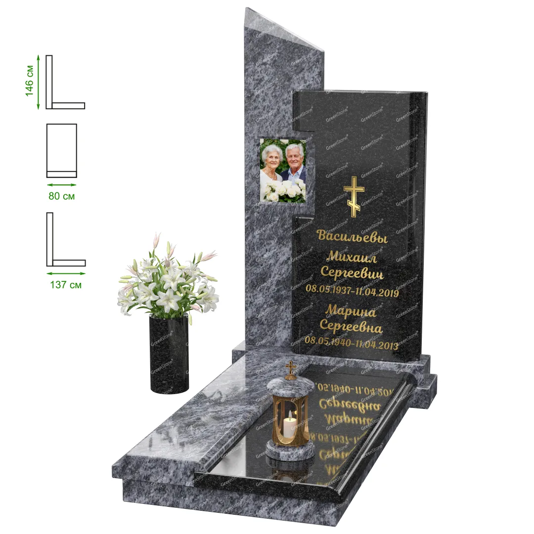 Визуально комплекс отличается от типовой формы не только формой, но и размерами. Массивная стела позволяет дизайнеру реализовать практически любые задумки и пожелания Заказчика, придать готовому изделию солидный вид, раскрыть все достоинства использованного в его изготовлении гранита. Такой габаритный памятник требует профессиональной доставки и установки. Все это также можно заказать в мастерской Грин-Стоун.